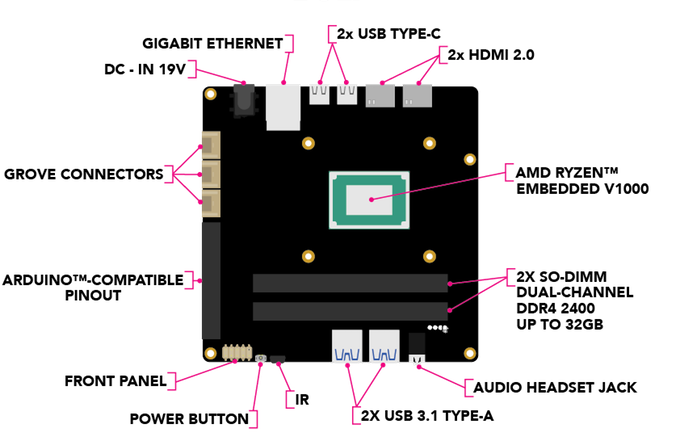 - A choice between two AMD Ryzen Embedded V1000 series SoCs: